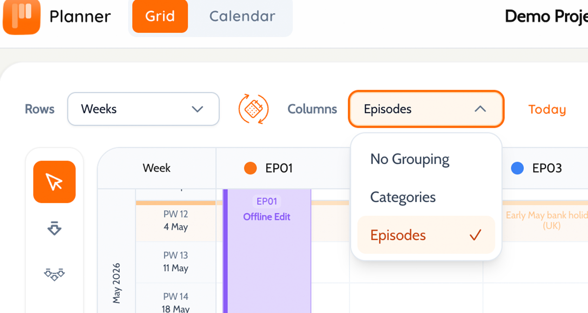 Move from dates to crew, episodes, or categories whenever you need to. The schedule stays intact - only the view changes.