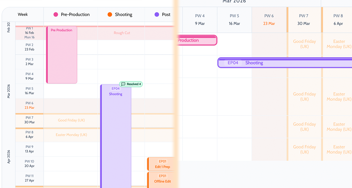 Bigger productions. More departments. More people who need the schedule to look different. That is where having one live plan underneath all of it actually matters.