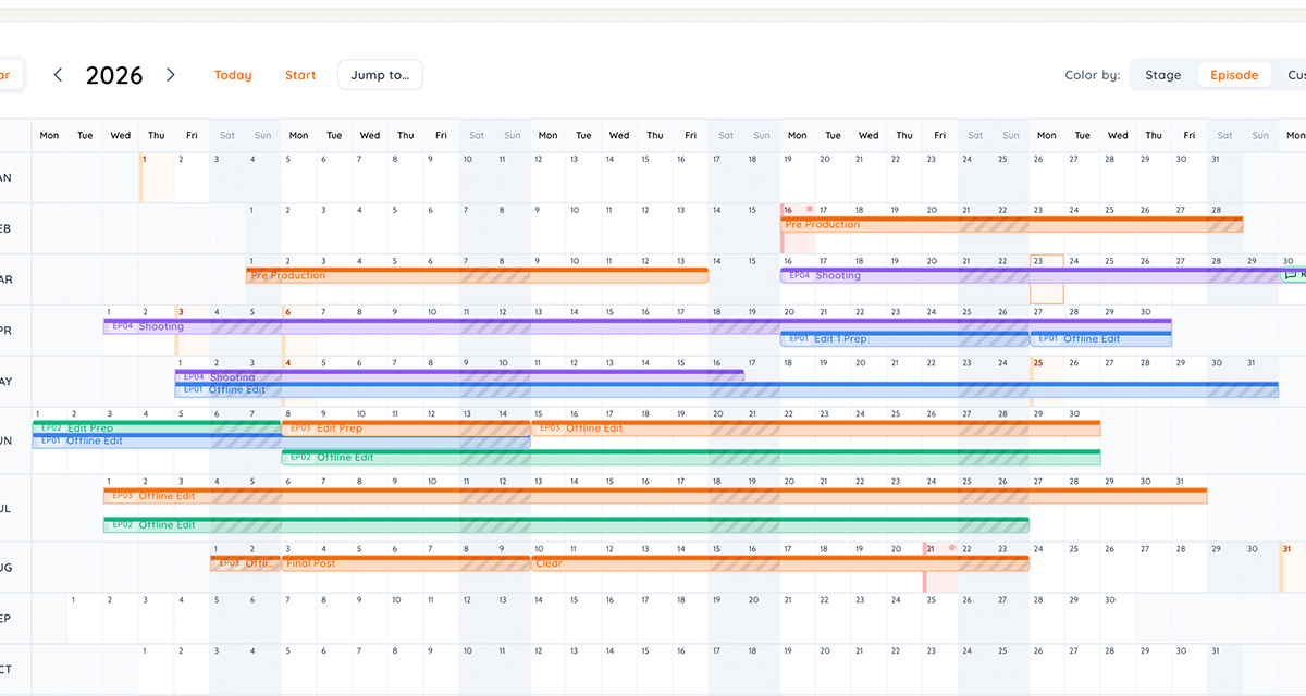 Review the schedule through the episode, category, or crew lens that matches how their work is actually planned.
